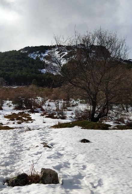 Ideal si buscas una ruta sencilla, bonita y no especialmente larga. Se trata de un sendero que circula por la Dehesa Boyal de Montejo de la Sierra, un buen ejemplo de cómo se gestiona de forma comunal los recursos de la zona. Parte del mismo pueblo, situado entre montañas que ya forman desde el principio un paisaje digno de postal. El camino es bastante llano y cuando nosotros lo visitamos estaba cubierto por un ligero manto blanco de nieve que le daba un encanto especial.