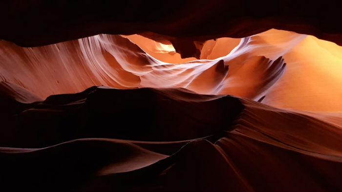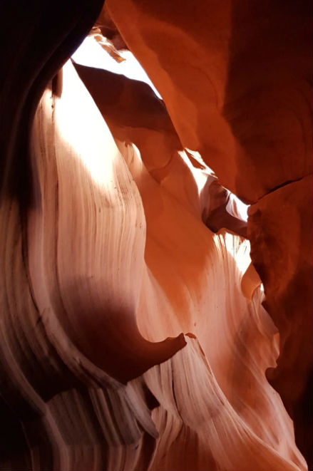 Seguro que os suena una de las imágenes más típicas del Antelope Canyon o Cañón Antílope: altísimas y estrechas paredes de color ocre serpenteantes y desde donde la luz se cuela haciendo un juego de luces y sombras. Para ver al sol colarse hasta el suelo y contemplar ese fenómeno que muchos viajeros captan con sus cámaras tienes que llegar prontito si vas como nosotros en octubre (de 9 para atrás) y entre las 11 y las 12 si lo visitas en verano.