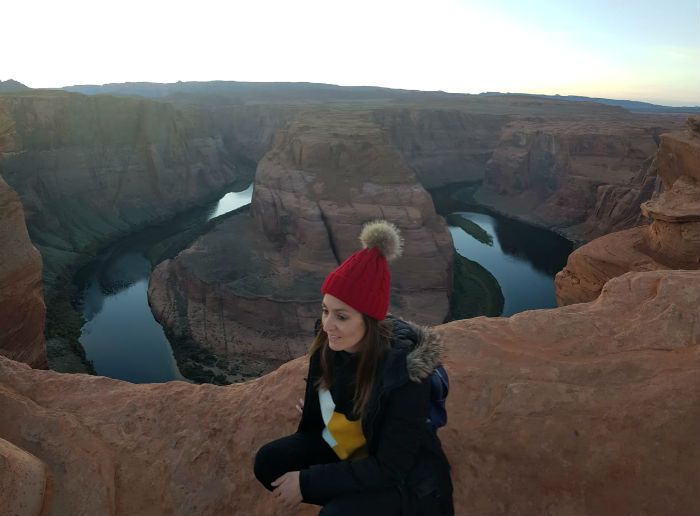 Nuestra primera visita fue la Horseshoe Bend, en castellano conocida como la Curva de la Herradura. Se trata de un meandro provocado por el Río Colorado con una profundidad y altura impresionantes. Quizás la genial perspectiva que se logra desde el mirador, el color rojizo de la roca y los galones del río hacen que el lugar sea tan especial, pero es sin duda uno de los paisajes más bestias y armónicos que vimos en el viaje.horseshoe-bend