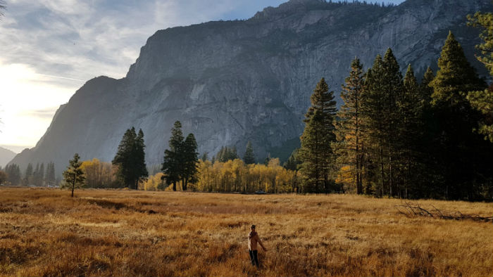 Llegamos tomando la carretera que cruza el parque y disfrutando en todo momento de su paisaje y riqueza natural. En primer lugar, simplemente hicimos un paseo a Mirror Lake desde el mítico (¡y caro) hotel The Majestic, que acabó siendo uno de los momentazos del viaje. Para volver tomamos una ruta alternativa poblada de hojas amarillas; una estampa preciosa donde nos avisaron que había un oso. Aunque lo recomendable es hacer ruido (y hacer así que el oso tenga miedo y conserve sus instintos), nos acercamos lo suficiente como para verlo y que no percibiera nuestra presencia. Con su pequeño retoño, no adviritió la presencia humana y nosotros, aún extasiados, contemplamos atónitos el espectáculo.