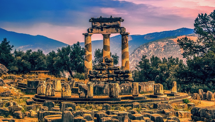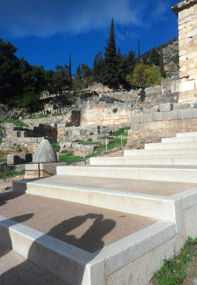 La Historia nos dice que, ya desde tiempos inmemoriales, había en el lugar un templo dedicado a Apolo, hijo de Zeus y dios protector, paladín de la verdad, la adivinación y las artes. Se hizo muy famoso en el mundo heleno por las acertadas predicciones de su Oráculo, una mujer elegida a modo de sacerdotisa, la pitonisa o sibila, para intermediar entre las personas y el dios con el fin de aconsejarlas y guiarlas en sus decisiones vitales. Reyes, militares, ciudadanos anónimos se acercaban en peregrinación hasta Delfos para orar y consultar todo tipo de asuntos: batallas, litigios, economía, familia, personales. Delfos se convirtió en la Roma de la época, el ónfalos, el centro del mundo. La entrada es una explanada donde los peregrinos se reponían del viaje y preparaban sus ofrendas antes de franquear las murallas que rodeaban el santuario. Luego se dirigían al templo por el camino sagrado, que trepa ondulado monte arriba bajo los imponentes peñascos rojizos.