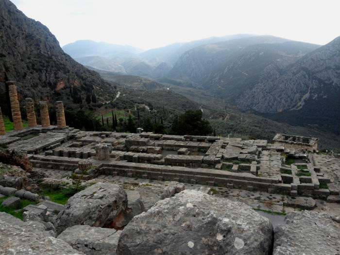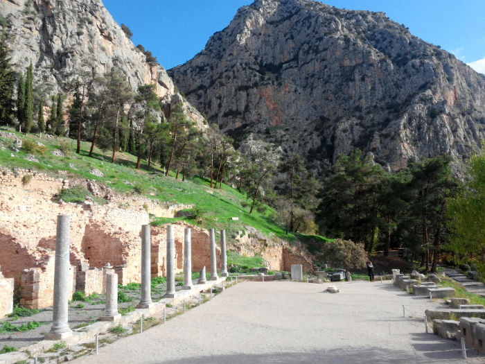 Como ahora nosotros, pisando las gastadas lajas del suelo, entre piedras y más piedras venerables a ambos lados del camino: restos de templos, estelas, estatuas, columnas, capiteles, altares… Pero son los tesoros los que destacan, especialmente los más valiosos, algunos verdaderas joyas arquitectónicas, llenos en su momento de oro, plata y de ricos regalos y exvotos. Era la manera en que las polis y sus gobernantes honraban al dios para propiciar o celebrar la suerte en sus empresas políticas y militares y, al mismo tiempo, mostrar su poder. Destaca el Tesoro de Atenas, un templo en miniatura ahora reconstruido que nos muestra aún sus mármoles, columnas y relieves y nos permite imaginar la opulencia que, desaparecida o ruinosa ahora, brillaba a su alrededor. Dominando ese botín y la impresionante panorámica del monte y del valle, alcanzamos el corazón de esta acrópolis: el Templo de Apolo, hoy tan solo su extensa planta rectangular y algunas altísimas columnas en pie que hablan de su antiguo empaque.
