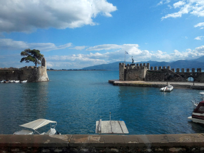 Enseguida entramos en Lepanto (nombre castizo de Naupacto o Náfpaktos), una pequeña ciudad que se aprieta entre el monte (sólido mirador panorámico sobre la bahía y el puente, en su falda aún se divisa la fortaleza de la época veneciana) y el mar, donde se cobija un precioso puerto amurallado y rematado por dos torreones y una mezquita.
