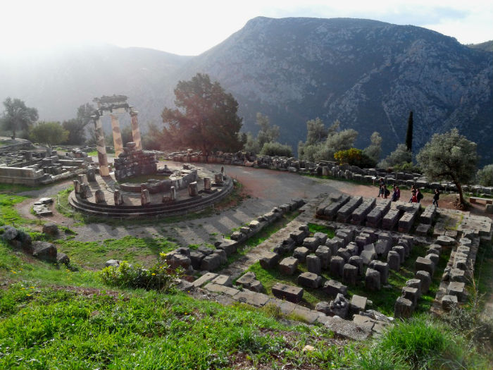 Una carretera aun más curvada, estrecha y pendiente que la que acabamos de dejar nos sube al actual pueblo de Delfos, apenas dos calles dedicadas por completo al turismo visitante. Al poco de cruzarlo, ya se divisa el yacimiento de la antigua polis. A la izquierda, la mole roqueña del monte sagrado, con sus acantilados calizos y su mata boscosa, bajo cuyo amparo se halla el yacimiento principal; a la derecha, un valle profundísimo plagado de un mar de olivos y sendas terrosas que bajan hasta el agua del golfo. Comenzamos bajando por este lado hasta el cercano y pequeño oratorio de Palas Atenea, la diosa de la guerra, especie de antesala separada del conjunto principal; destruidos sus templos, aún se aprecia, entre el montón de piedras ruinosas, la planta circular y algunas de las muchas columnas de su característico tholos de arcaica construcción. Volviendo a la carretera en dirección al pueblo, empotrada entre la cuneta y el monte, está la Fuente Castalia, que aportaba el agua de las libaciones rituales del santuario, al que entramos un poco más arriba; según la mitología, aquí se reunían los dioses con las náyades del bosque.