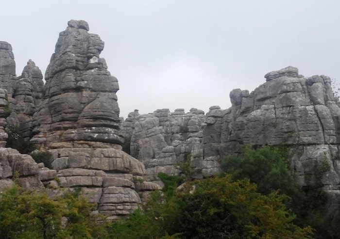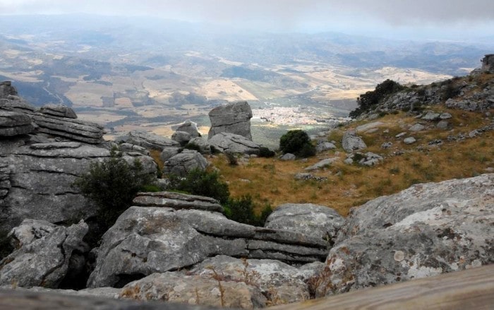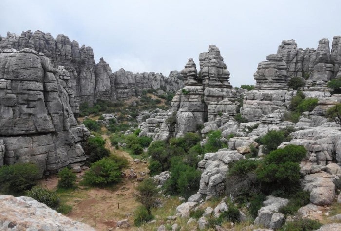 Saliendo de Antequera hacia el sur por la carretera de Villanueva de la Concepción, una desviación anunciada nos sube a la sierra de El Torcal. Su nombre alude a la existencia de numerosas torcas o hundimientos redondeados del terreno con paredes irregulares, verticales y escabrosas. Son lo que los geólogos denominan dolinas, que aquí se alternan con rocas de todos los tamaños y originales formas que despiertan la imaginación del visitante, con crestas, paredes, estratos, grietas, simas, entrantes y salientes, cuya desnudez no impide que la vegetación, desde pequeños matorrales a árboles centenarios, aparezca por todos lados. No es más que un ejemplo de relieve cárstico, aquí con resultados muy vistosos, que el agua va labrando, lenta pero inexorable sobre los suelos de roca caliza, por erosión química continuada.