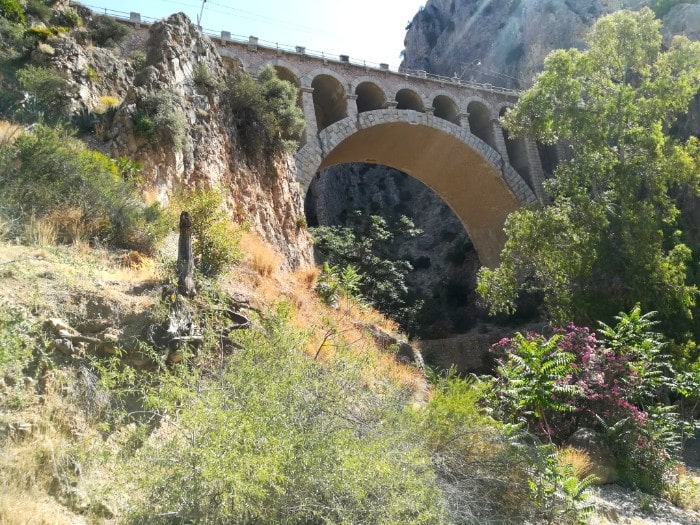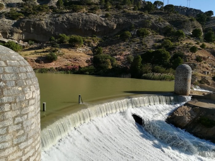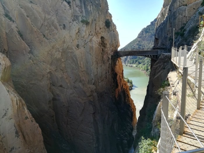 Estamos cruzando el Tajo de la Encantada, que se abre, al final, en el embalse de su nombre. Hay alguna zona de descanso, se ve algún tramo del canal, se cruza algún pequeño túnel, asoman los de la vía férrea y, con suerte, pasa el tren, se afronta el vértigo de un mirador de cristal sobre el agua y un moderno puente colgante cambia el camino a la orilla izquierda del río. El último tramo, de pendientes escaleras, pronto nos deposita en la puerta de salida, donde la hoz fluvial se abre a un paisaje más amplio y luminoso. Aún tenemos que caminar por pista de tierra algo más de dos quilómetros hasta rematar el recorrido en la terminal del bus lanzadera de El Chorro, a pie de embalse, que nos devolverá por carretera al aparcamiento inicial. Todo un sensacional escenario de cine que De Niro o Sinatra, entre otros, pudieron compartir y rescatar en su momento para el séptimo arte.