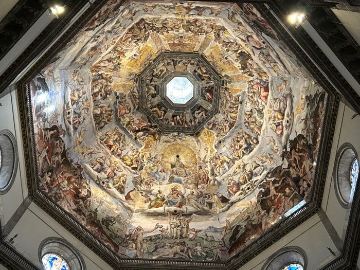 Pero no queríamos dejar de visitar la Catedral de Santa María del Fiore, el monumento más conocido de la urbe. Si haces una cola enorme la entrada es gratuita, pero dado que Luca necesita estímulos constantes y lleva mal la espera, tampoco era una opción. Así que elegimos pagar unos 25 euros y entrar a la Catedral sin colas. El tique, además de la entrada prioritaria, incluía una guía que nos contaba detalles sobre el lugar. Sorprende porque la catedral por dentro es bastante sobria, hasta el punto que lo más destacable es el suelo… a excepción, claro está, de la cúpula. Esta, de impresionantes dimensiones, tiene un fresco sobre el juicio final que hace que la entrada merezca la pena. Sus más de 700 pinturas son una joya incalculable digna de admirar.