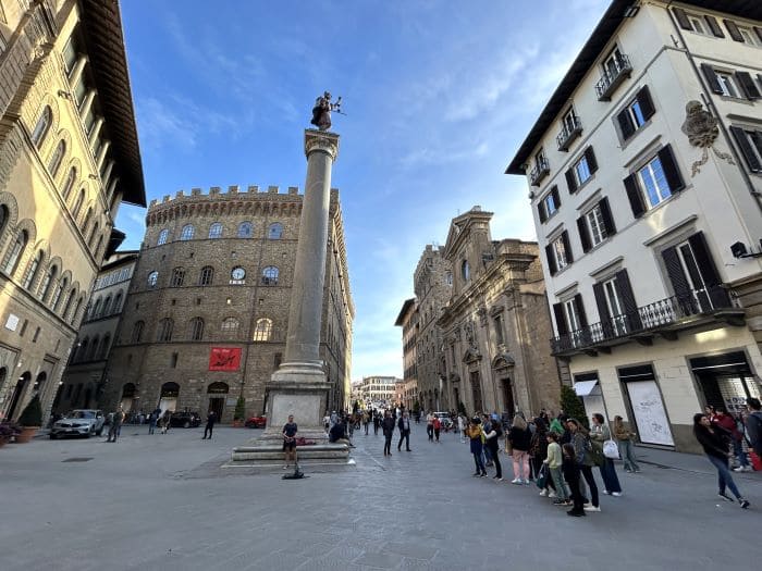 Las tres plazas citadas están muy cerca y entre ellas, se entrelazan las calles más animadas y comerciales. Quizás demasiado. Pero mantienen su monumentalidad y belleza. En ese espacio, está también la Piazza del Mercato Nuovo, donde está el jabalí que te asegurar volver a la ciudad con un toque de hocico. En los días siguientes pasaremos muchas veces por estas calles, pero encontraremos el verdadero encanto (para nuestro gusto, claro) paseando más allá de sus límites.