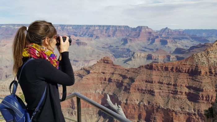Se trata de Mather Point, el primer punto desde donde contemplamos el espectáculo por primera vez. La vista resulta abrumadora y aunque hay zonas donde el lugar está preparado para proteger a la gente del enorme salto que genera el acantilado, supongo que fue imposible ‘ponerle puertas al campo’ y hay multitud de rincones naturales desde donde lograr la mejor foto. Eso, en tiempos de selfies, se traduce en muertes, por lo que tengo que advertir del peligro que puede suponer jugar con la naturaleza en su máxima expresión. Por otro lado, con cuidado y un poco de ojo, el lugar se convierte en el mejor decorado posible para disfrutar de este tipo de menesteres.