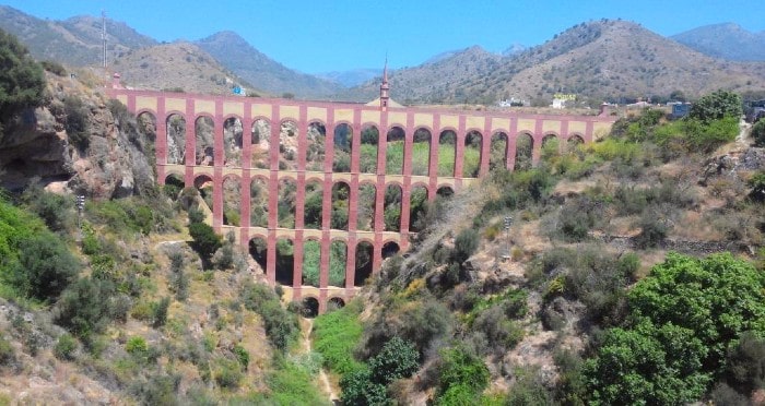El campo de Nerja está lleno de huertas e invernaderos de frutales que necesitan agua. Por eso, en una tierra seca de lluvias escasas como esta, la tradición morisca de pozos, acequias y canalizaciones ha creado una completa red de regadío que aún perdura en gran medida y que se basa, principalmente, en el aprovechamiento del agua que el río Chíllar aporta desde la sierra cercana. Entre esas estructuras de riego, destacan dos grandes obras de ingeniería industrial decimonónica que todavía se mantienen en pie, y funcionando: los acueductos.