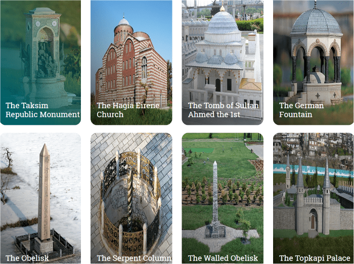 Se trata esta vez de una interesante exposición al aire libre de réplicas en miniatura de las manifestaciones más importantes de la arquitectura y la historia turcas, tanto de la ciudad y del país como de algunas zonas cercanas relacionadas con el antiguo imperio otomano. Palacios, mezquitas, casas populares, construcciones rurales y urbanas, torres, puentes, templos, monasterios y demás monumentos y construcciones, perfectamente reproducidos a escala y ordenados y explicados bajo una lograda idea de conjunto. Las más de un centenar de maquetas diferentes se distribuyen, además, a lo largo de un recorrido de calles peatonales, zonas verdes, cómodos aparcamientos y todo tipo de servicios, incluido un Parque Infantil donde los niños pueden jugar libremente y descargar todas las tensiones de un viaje tan intenso en un ambiente apropiado.