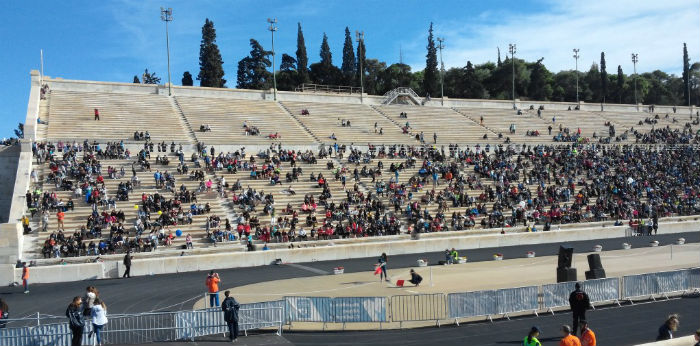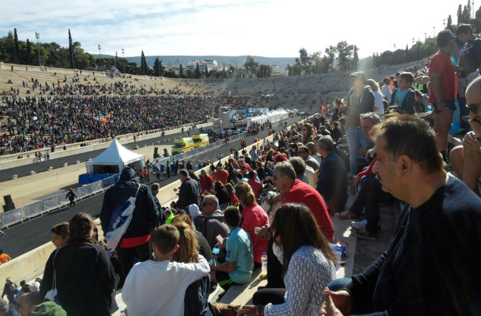 Avenidas grandes, altos edificios, tráfico, túneles, puentes y cruces con mucha animación anuncian ya la entrada en las primeras calles de la capital. Los alrededores de la gran avenida Sofía reciben al ahora eufórico pelotón con un despliegue de monumental arquitectura: hospitales, hoteles, embajadas, museos, parques y demás, que lo llevan en volandas al centro, a la plaza Syntagma. Solo queda cruzar los Jardines Nacionales por una de sus calles arboladas para entrar en el mítico Estadio Panathinaikós, con su pista cenicienta y sus gradas de mármol blanco. No hay 80 000 espectadores, como en la primera cita olímpica, pero la Historia, el lugar y la emoción de pisar la línea de meta y colgarse la ansiada medalla transportan por unos instantes, al afortunado que lo ha conseguido, a la gloria del Olimpo (el monte sagrado que queda al norte del país, muy lejos de aquí), donde los dioses lo coronarán con la clásica rama de olivo, como hicieron en el Mundial de 1997 con los españoles Antón y Fiz, oro y plata entonces, cuando aún no se había impuesto el monopolio de los atletas africanos. Vuelto a la realidad, tan solo pensará en estirar y recuperarse del esfuerzo. A quien madruga, Zeus lo ayuda.