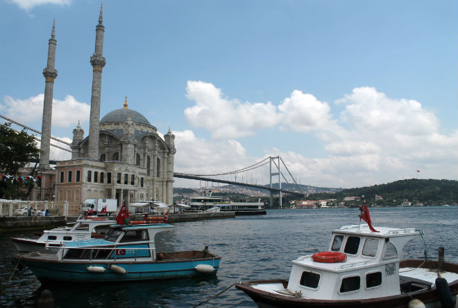 El Canal del Bósforo brilla bajo las primeras luces del día, los barcos surcando el agua y las orillas tomadas por el caserío, que empieza a despertarse en este día de descanso. Al final del quilómetro largo de puente, abajo a la izquierda, sus grandes cables de suspensión sobrevuelan la cúpula y el par de minaretes de la Mezquita de Ortakoy, una pequeña joya que servía de capilla a los sultanes de turno, maravilla de la arquitectura otomana en piedra y mármol blanquísimos que reflejan su luz sobre el agua.