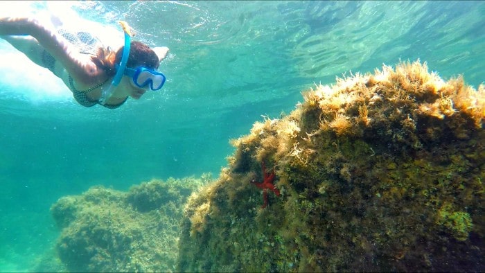 El camino es relativamente sencillo, pero el sol pega fuerte y al final hay una pendiente. El entorno es realmente precioso y ayuda, pero a veces uno pide la hora, está claro. Cuando llegamos entendimos lo que mucha gente nos había dicho y es que tanto la forma (forma una pequeña bahía con pequeños islotes) como el agua hacen que Pregonda sea muy especial. Así que nos relajamos, tomamos varios baños y hacemos snórkel. En esta última aventura, ¡llegamos a ver una estrella de mar! Y peces algo diferentes que en las veces anteriores, si bien no abundan y hay que tener mucha constancia.