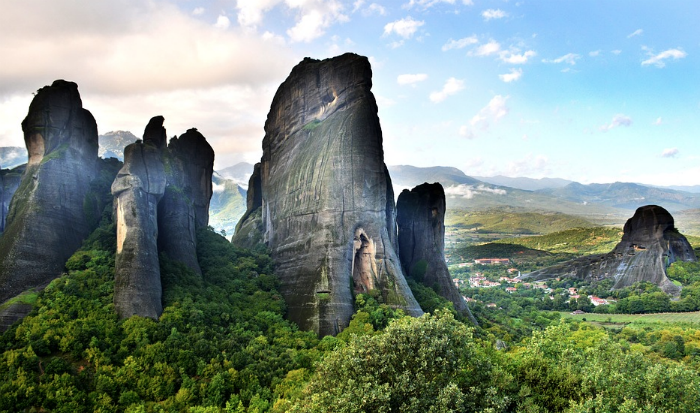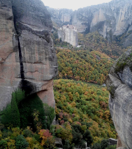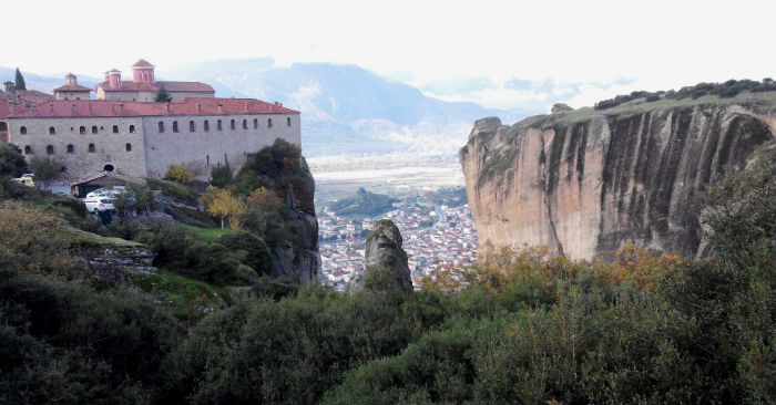 En el centro de la planicie, alcanzamos la ciudad de Kalambaka, puerta de entrada de nuestro destino final: el valle de Meteora. Los cataclismos naturales y los caprichos del tiempo han modelado aquí un paisaje sobrenatural, un conjunto de rocas gigantescas, desnudas, y estilizadas que se elevan como descomunales columnas o dedos grisáceos, arrugados y agujereados por la erosión, dejando entre sí precipicios de vértigo tapizados de verde y ofreciendo sobre sus cimas solares impensables donde se levantan inexpugnables monasterios. Naturaleza y esfuerzo humano unidos para crear uno de los mayores espectáculos del mundo. La mitología religiosa lo ha atribuido a creación divina, bien como colosales armas con las que Zeus aplastó a los rebeldes Titanes, en versión pagana, bien como meteoritos llovidos del cielo, de ahí su nombre, en versión cristiana. Y si bien es cierto que semejan una obra titánica y que, sobre todo entre la niebla, se han visto como escondidas catacumbas suspendidas en el aire, su verdadero origen natural es bastante menos poético.