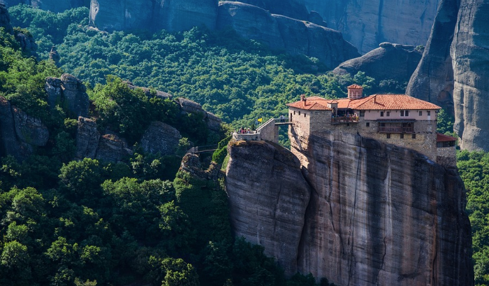 Como sorpresas particulares, en la primera de las visitas nos muestran un vetusto y original tonel de madera y el sistema elevador de red, carro y polea que allí usaban antes de contar con carreteras y grúas para subir y bajar personas y cosas por los peligrosos precipicios; y en el otro convento, el único regido por mujeres, monjas siempre vestidas de oscuro, destacan sus cuidados jardines, sus característicos torreones rosáceos y, sobre todo, sus vistas de postal sobre la ciudad y la extensa llanura, bien abajo, cruzadas por el mítico río Peneo y cerradas, al fondo, por las montañas peladas de la cordillera. Si este fantasmal territorio del aire es un buen lugar para la meditación y el desprendimiento, no lo es menos para montañeros y escaladores que, como los que ahora vemos trepar por uno de estos escarpados peñascos, vienen atraídos por el especial magnetismo que aquí se respira. Porque no será el cielo, pero se siente muy cerca.