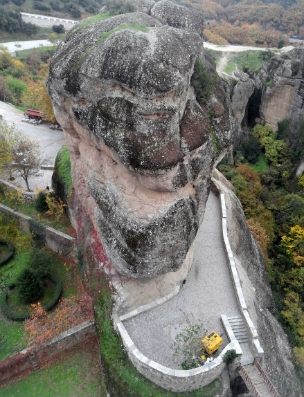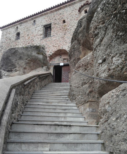 Desde Kalambaka, abajo en el valle, ya se divisan los enormes promontorios, que se ciernen sobre el caserío como oscuras amenazas rocosas. Pero es a partir de Kastraki, un pueblecito algo más arriba, donde uno se ve sobrecogido en un mundo diferente, solo apto para los intrépidos pioneros, religiosos y laicos que lo poblaron y domesticaron sin otros medios que la necesidad y los sueños. Desde la carretera, lo primero que destaca es una capilla excavada a la derecha en pleno farallón rocoso, donde se celebra cada navidad la tradicional fiesta de San Jorge de los Pañuelos, suponemos que para romeros sin vértigo. Subiendo y subiendo, girando y girando, empiezan a verse ya los primeros recintos estilitas colgados sobre el abismo aquí y allá en lugares antes inaccesibles, como casas colgadas de las nubes.
