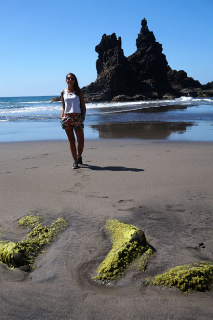 La playa nos espera. Benijo y esos versos de un amor de verano que tanto escuché. Un paisaje que al principio puede parecer uno más, pero que a medida que bajas sus empinados escalones y a medida que vas haciéndolo tuyo, vas siendo consciente de que es muy especial. Que dentro de un rato no te vas a querer ir. Que te apetece bañarte una y otra vez y que te sientes muy pequeña allí. Que la naturaleza es a veces lo único necesario. Si te enamoras en Benijo, te enamoras dos veces; supongo. Y yo también al final acabé rendida.