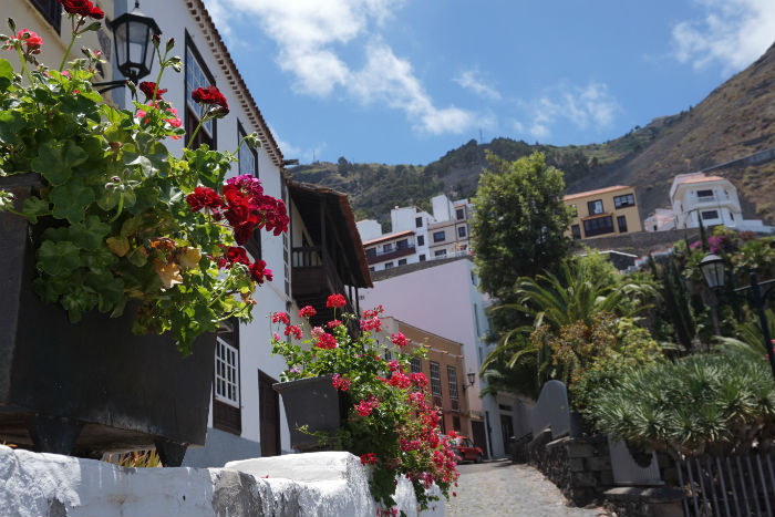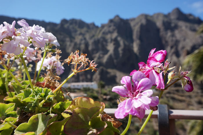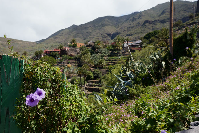 El pueblo es tan bonito como curioso. Las casas van salpicando la ladera, que es abrupta y forma recovecos encantadores. Hay dos bares que ejercen como balcón para ver las vistas del barranco que cae por debajo del pueblo y que se puede recorrer en una ruta de unas cuatro horas y que lleva a los Gigantes, pero que nosotras por falta de tiempo descartamos. Un vendedor ambulante nos ofrece fruta en el camino que lleva a ese peñón tan característico del lugar, que culmina el recorrido y que mejora aún las vistas del pequeño camino realizado.