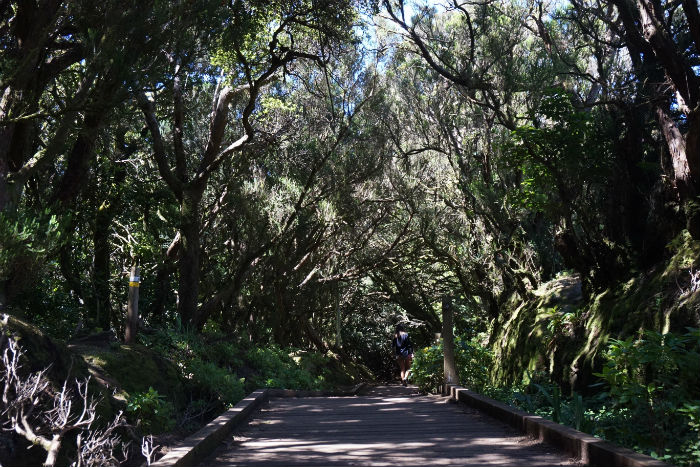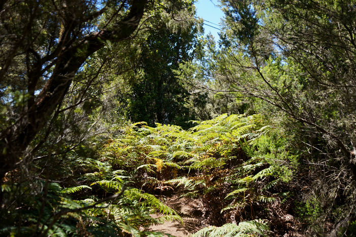 De camino, paramos en el mirador de Cruz del Carmen, con unas vistas espectaculares de lo que dejamos atrás. En la carretera, los árboles comienzan a cerrar el camino y pronto hay una explanada desde donde parten diversas sendas que se adentran en terreno de laurisilva. Nosotras elegimos la más sencilla, el Sendero de los Sentidos, que es una pequeña ruta circular de unos tres kilómetros, perfectamente señalizada e indicada con el número ‘3’. El color verde es el auténtico protagonista y es difícil de imaginar cuantísima naturaleza encierran estos caminos.