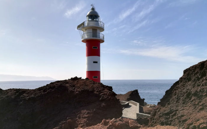 Estamos llegando al poniente alto de la isla. Y a la entrada del pueblo de Buenavista del Norte, tomamos una carretera local en busca de otro de sus escondidos tesoros: la Punta de Teno, un cabo que parece del fin del mundo.  Son solo un puñado de quilómetros de pavimento bueno y carretera cuidada, pero el perfil sinuoso, la estrechez que nos encajona entre los amenazantes peñascos gigantescos del monte y los acantilados cortantes a muchos metros sobre el agua, con la sensación de estar perdido dentro de un paisaje a la vez inquietante y espléndido.faro teno
