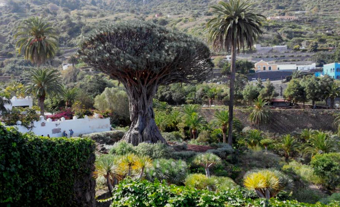 El tronco, tan largo en la circunferencia base como en su altura, es un asombroso conglomerado arbustivo de ramas nudosas, ampliamente ahuecado en su centro, que se remata con una frondosa copa colosal. Y no está solo. Lo acompañan multitud de plantas endémicas del archipiélago cultivadas sobre un vasto terreno ganado a un barranco seco y reconvertido así en el Parque del Drago, un recinto de ocio de exhibición floral. Merece la pena pagar la entrada, nada cara por otra parte, para disfrutar del lugar y de su longevo protagonista, además de contribuir a su conservación.