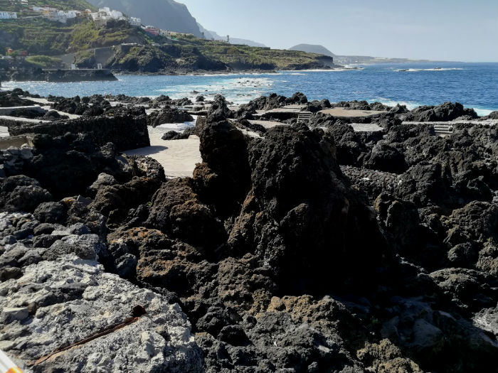 Siguiendo nuestra ruta, a la salida de una curva apretada entre el agua y los altos peñascos que circundan el lugar, entramos en Garachico, uno de los nombres que más suena de la zona. La carretera cruza el pueblo a lo largo del paseo marítimo.