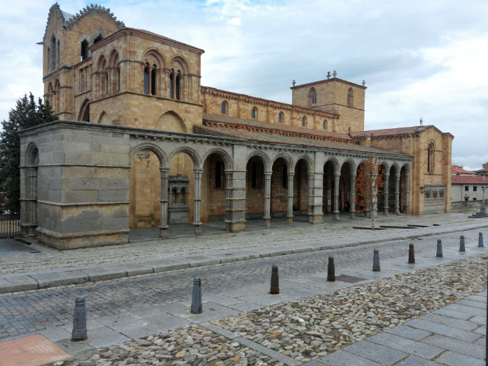 Debajo se abre la monumental Puerta homónima, de torreones y verracos, que mira a la iglesia de San Vicente, una joya románica en arenisca de colores cálidos que no se puede perder (en nuestra visita, luego, tuvimos la suerte de escuchar la estupenda actuación improvisada de un grupo coral foráneo en el centro de la nave principal; más tarde, nos enteramos de que, sobre todo en otoño, hay muchos extranjeros mayores de visita en la ciudad, turismo cultural y religioso), donde brilla en especial el Cenotafio de los Mártires, arca de piedra policromada y labrada con relieves historiográficos.