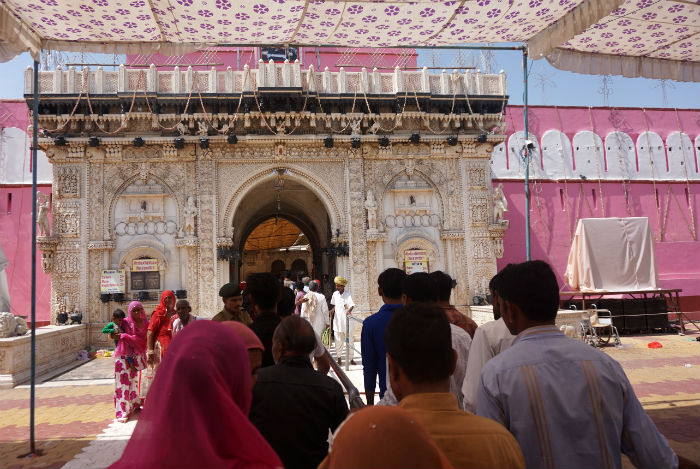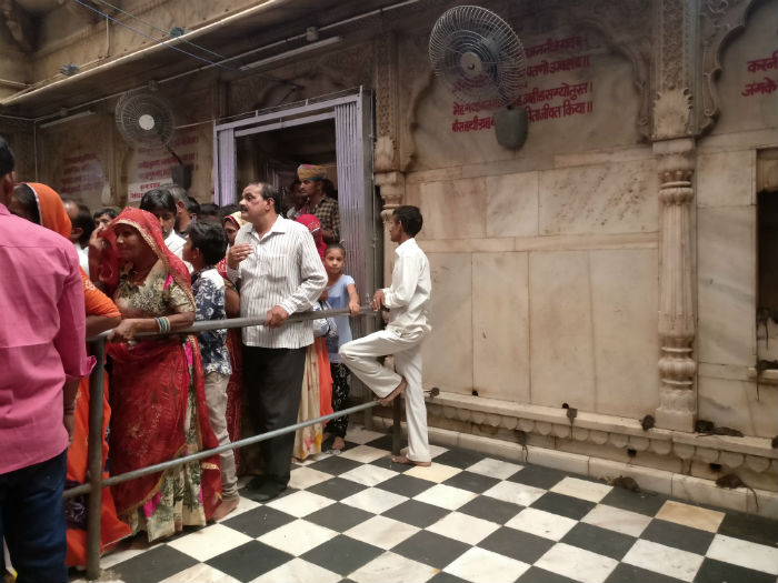Cuando llegamos no lo podíamos creer. Delante del templo, afuera, nos esperaba una ingente concentración de peregrinos y visitantes que llenaba la extensa explanada donde estos son recibidos y donde se celebra un rebosante mercadillo de fiesta, ropa, comida, artesanía, banderas, himnos, música y demás: la Feria del Divrati, una multitudinaria romería. Alcanzado con dificultad el recinto religioso, las colas son impresionantes, pero amenas para nosotros, que ya no sabemos a dónde mirar. Por fuera, el templo es una construcción de grandes dimensiones, con una parte nueva en obras, en la que sobresale el mármol blanco y las puertas de plata labrada. En el interior está la razón que atrae a tanta gente: las ratas o kabas.