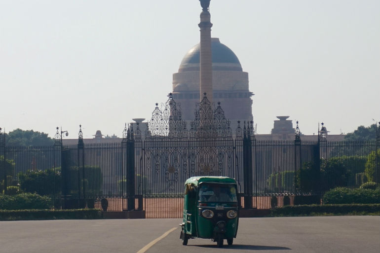 Es la herencia británica en positivo que, calles más abajo, alcanza su esplendor en el Rajpath, el camino real, un largo e imponente bulevar, peatonal o restringido al tráfico en su mayor parte, que cruza en perpendicular flanqueado por zonas verdes de estilo inglés con parques, jardines, sendas y canales de agua. Arranca en la Puerta de la India (de espaldas al Estado Nacional), la Indian Gate, un monumental arco de triunfo. Sus alrededores conforman una amplísima zona de paseo siempre llena de gente. Subiendo hacia el oeste, se cruza una avenida transversal y se entra en la plaza ceremonial de la Victoria, pasando el que pasa por ser el primer semáforo del país, aún en pie, alcanzando el último tramo, más arbolado y señorial, en cuyos laterales se encuentran los magníficos edificios de los Ministerios y el Parlamento de la nación.