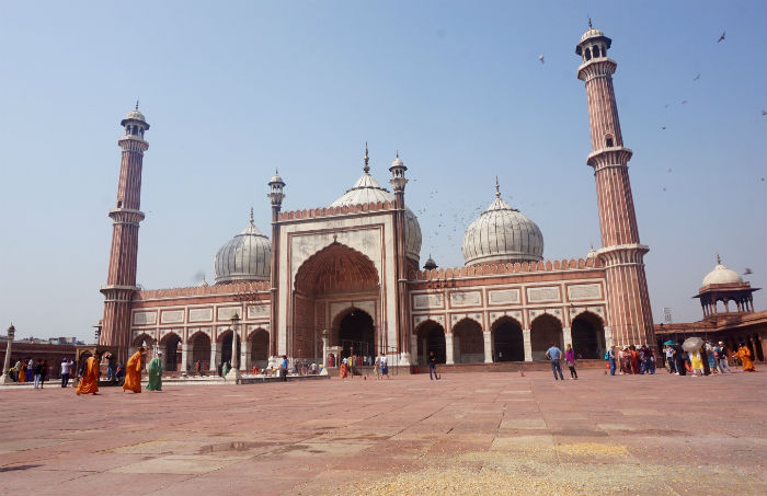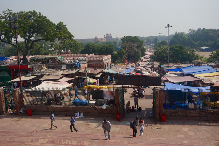 La mezquita es una construcción de grandes dimensiones que consta de un elegante portón monumental en fachada porticada en arcos y dos altos minaretes en las esquinas delanteras, todos rematados por pequeños pabellones abovedados, y varias cúpulas grisáceas rematadas por dorados pináculos. Dentro del porche de oración frontal a modo de amplio soportal con ciclópeas columnas, hay fieles de rodillas orando hacia la Meca. Fuera, enfrente, al otro lado del patio, desde la enorme terraza de la base, se puede contemplar el bullicioso centro del casco viejo. Es la zona de Chandni Chowk, un extenso mercado de mercados que fue antiguo zoco gremial de artesanos y comerciantes y hoy tiene de todo: ropa, calzado, comida, muebles, especias, animales vivos, herramientas, bisutería, quincallería, recuerdos y lo que caiga. Mires adonde mires, son todo bazares.