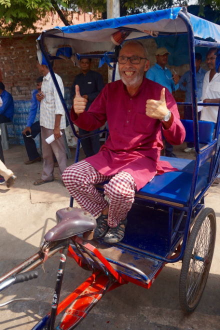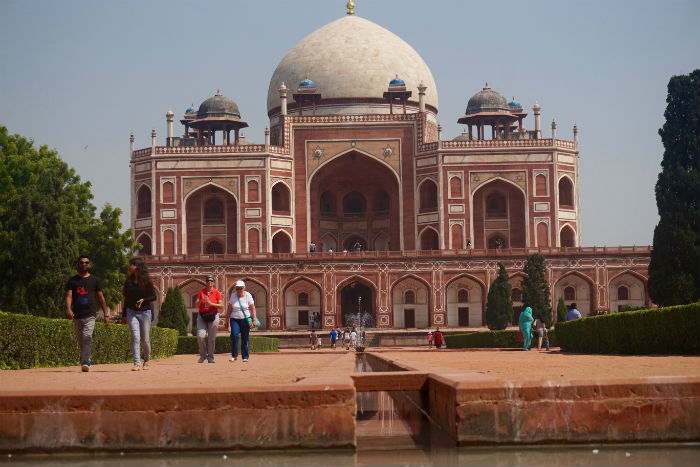 Más abajo, en dirección al río, se conserva un conjunto de construcciones funerarias pioneras del arte mogol en la India, en un espacio verde restaurado y cercado. Unidas por senderos de tierra, hay varias edificaciones, entre las que destacan algunas mezquitas y tumbas monumentales, siendo la principal la Tumba de Humayún, el segundo emperador mogol, cuyo diseño supuso la base inspiradora del Taj Mahal: jardín del paraíso, base elevada, simetría, planta octogonal, cúpula, arcos y sombreros, sala central y laterales, decoración. Solo que aquí domina el rojo de la arenisca, y es esporádica la presencia del mármol, el blanco material de la maravilla de Agra. Un grupo de maestros nos solicitan la foto típica con el casual extranjero. Vienen de la sureña Bangalore, la capital tecnológica del país, aprovechando que estos días disfrutan de un breve asueto festivo.