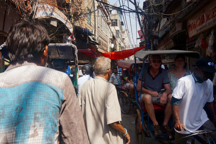 La ciudad antigua se encuentra al norte, dominada por la impresionante mole del Lal Qila o Fuerte Rojo, levantado a orillas del río por Shah Jahan, el mismo emperador mogol que también intervino en su homónimo, muy similar, de Agra, ciudad que fue su capital un tiempo, y el mismo que pasó a la posteridad como responsable de la maravilla del Taj Mahal. También amurallada y de arenisca roja, la ciudadela consta de una estructura muy parecida: una empinada calle tras la puerta de entrada, un patio de distribución abierto, salón de audiencias y trono real (el original Trono del Pavo Real y sus legendarios diamantes, una riqueza que compartía con Agra y que sería expoliado por persas y británicos), estancias privadas del rey y de las damas, siempre en zonas separadas, alcobas reales, unos baños turcos, una pequeña mezquita blanca y un jardín con estanque y pabellón central.