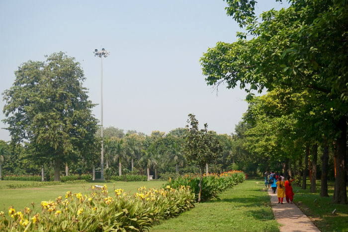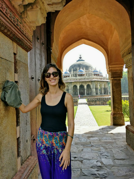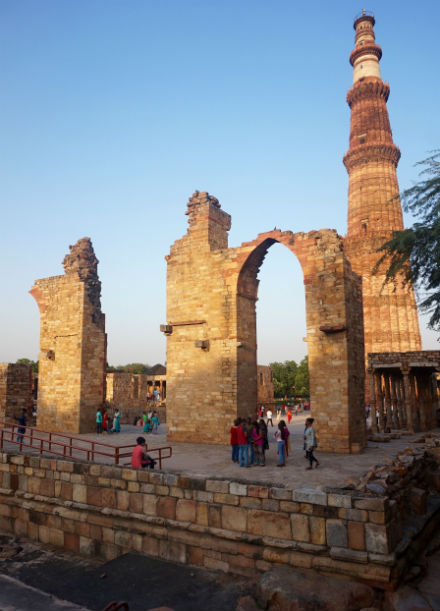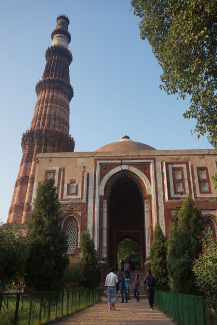 Es como un parque cerrado, verde y arenoso, con paseos y montículos entre los que corretean las ardillas y deambulan los muchos visitantes, siempre bajo el incesante ruido de los aviones que se acercan o se alejan del vecino aeropuerto internacional Indira Gandhi. Cruzamos la darwaza, la puerta de entrada, de impresionante porte y decoración, y entramos en un mundo de ruinas donde solo quedan en pie algún mausoleo, restos de templos y mezquitas, pilares, arcos, esculturas, columnas, capiteles y piedras, muchas piedras, tanto de las antiguas construcciones indias como de las posteriores edificaciones islámicas.