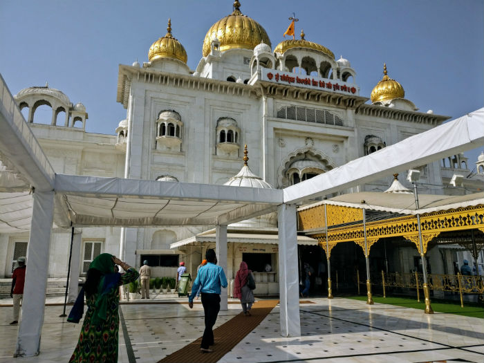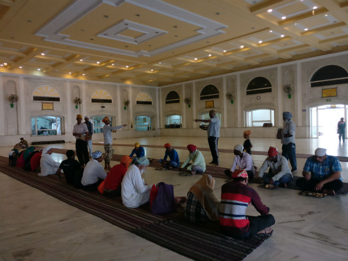 Esta religión tiene sus templos abiertos a todo el mundo, sin distinción de creencias, raza o poder, y acoge a cualquiera que lo necesite; su bandera amarilla ondeando al viento es signo de hospitalidad y comida aseguradas. Descalzos y con la cabeza cubierta, entramos al templo, escalinatas, paredes y suelos de un mármol blanquísimo, por dentro y por fuera, que contrasta con el oro de las cúpulas, del dosel exterior de acceso y del techo interior de la zona sagrada. En esta, engalanada con pulcra sencillez, varios elegidos (no hay sacerdotes en esta fe) dirigen el ritual entre música, cantos, lecturas y vapores solemnes, mientras los fieles, que entran y salen sin cesar, tras hacer la visita obligada al libro sagrado y al habitáculo del gurú de turno, los acompañan en la oración sentados en el suelo.