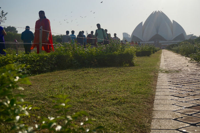 Y, por encima de todas, el alto minarete de la desaparecida mezquita, el Qutub Minar, una enorme torre de ladrillos de arenisca roja, tallada y decorada con la filigrana caligráfica de diferentes aleyas o versículos coránicos. En medio del recinto, llama la atención una estilizada columna de hierro oscuro dedicada al dios Shiva, el único recuerdo que queda del viejo templo sobre el que se erigió la mezquita, testigo de la destrucción y símbolo del triunfo contra el tiempo. Salimos hacia nuestra última visita, algo más arriba en dirección al río. Dentro del parque Astha Kunj, pegado a la plaza Nehru, brilla de forma especial el Templo del Loto, una modernísima construcción, de los años 80, de la Fe Bahá’i, que, siguiendo el esquema de esa flor, símbolo de la India, muestra una original estructura circular de pétalos gigantes que engloban una sala central espaciosa, vacía y blanquísima de mármol griego, rodeada de un esmerado jardín de agua, césped y parterres florales. Su tirón turístico es enorme: hay gente por todas partes.