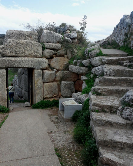 Una rampa de tierra nos conduce a la acrópolis de Micenas, estratégicamente ubicada para controlar las rutas que unían esta península con el resto de Grecia, inexpugnable fortaleza palaciega amurallada y construida con descomunales bloques de piedra (tanto, que la leyenda atribuye al trabajo de los Cíclopes), como lo demuestra su entrada principal, la famosa Puerta de los Leones, imponente vano sobre cuyo pesado dintel se han esculpido dos leonas, hoy acéfalas, que apoyan sus patas en un altar rematado por una columna simbólica.