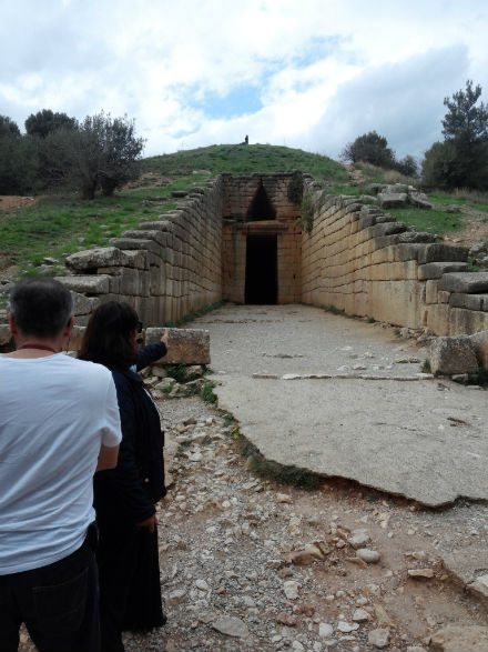 puerta-norte-micenasAntes de abandonar la zona, visitamos, muy cerca de aquí y del pueblo, la actual Mykines, el llamado Tesoro de Atreo, un tholos o monumento funerario (se suponía la tumba de Agamenón o de Atreo, su padre, pero surgen muchas dudas al respecto) que recuerda desde fuera las mastabas egipcias pero cuyo interior es de planta y bóveda circulares, con dos cámaras y un gran corredor de entrada.