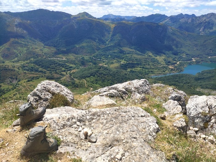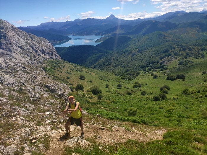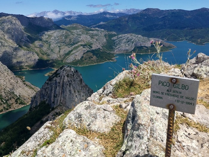 Esa imagen está compuesta fundamentalmente por Peña Sana (1.798 metros), Peña Cabeza (1.876 metros) y el Pico Yordas (1.964), a cuya vista se accede desde los 1.674 metros del pico Gilbo, pero también desde sus faldas; si bien cuanto más arriba, mejor. Con todo ello, la ruta merece la pena desde el primer momento. Comienza en el extremo opuesto al pueblo del Puente Pantano de Riaño y pronto, se aprecian ya tanto el bello paisaje como el precioso embalse de agua verde claro al que rodea. Tengo que reconocer mi emoción desde bien pronto hasta el final.
