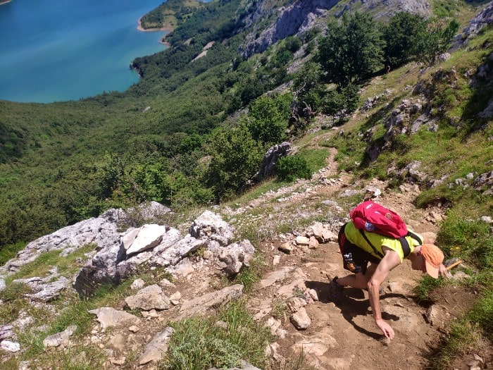 Pero aquí también llegará otro de los pequeños inconvenientes de la ruta: a partir de este momento, el terreno será pedregoso, estrecho y en determinadas zonas, se requieren determinadas dotes para apoyarse en las piedras y seguir (roza la escalada). No son tampoco grandes tramos y en general, cualquier persona con cierta destreza lo superará, pero no está de más comentarlo. En este sentido, lo más peligroso muchas veces es la bajada, donde nosotros nos dejamos caer tumbados en algunos momentos. Mejor ensuciarse que ponerse en peligro, ¿no?