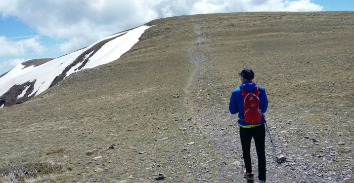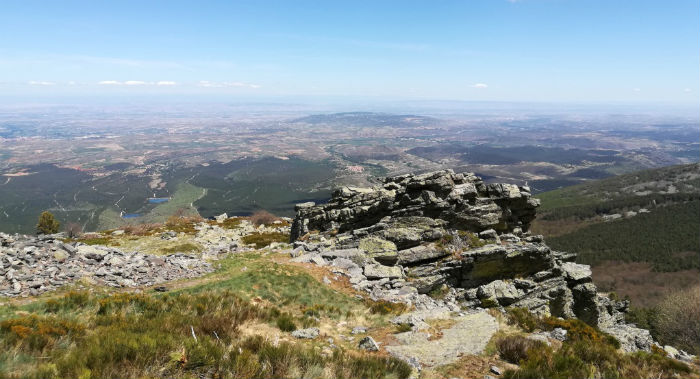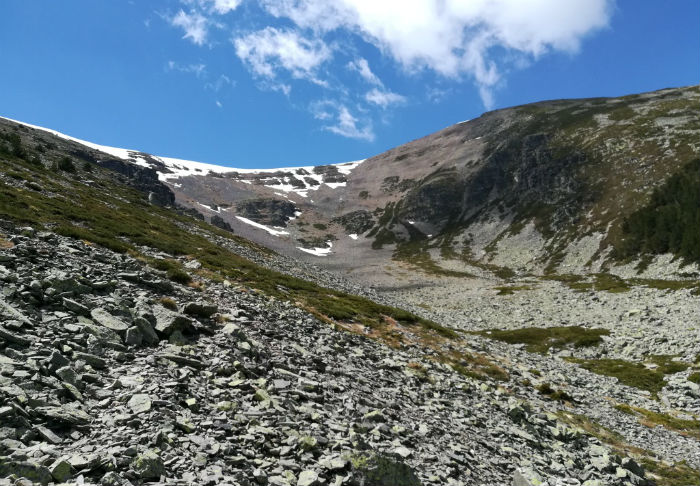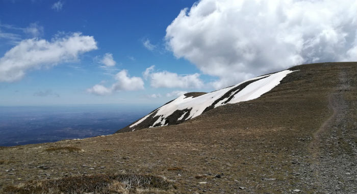 Para no correr ningún riesgo, evitamos la subida directa y optamos por la cota izquierda, una empinada loma de piedras de todas las formas y tamaños posibles, muchas de ellas sueltas, donde la senda serpentea en diagonal para suavizar la subida, perdiéndose su huella de vez en cuando, y donde conviene pisar con prudencia para no llevarse un susto. Es el Collado de las Piedras. Es el tramo que se hace más largo y trabajoso, con fuerte desnivel y piso inseguro, entre neveros que aún no han sucumbido al deshielo (esas grandes manchas que blanquean el monte), pero termina en recompensa: arriba nos recibe un suave altozano limpio y reseco, amplio y ondulado, que, por la derecha, nos llevará en volandas hasta el final. No hay cresta cortante sino un anchuroso cordal.