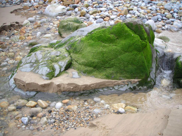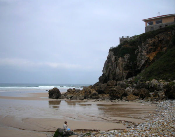 Volviendo sobre nuestros pasos, al llegar de nuevo al citado paso a nivel, alcanzamos tras una breve bajada de cemento la Playa de Buelna, coqueta y de arena fina, con sus rocas y su barandilla de madera. Aquí empieza la verdadera senda, un camino blanco y ancho de zahorra bien compactada por donde pueden circular los coches, aunque no son frecuentes. Todo él muy asequible, los tramos de subida serán escasos y muy cortos, y bastante similar en ambos sentidos. Inmediatamente después de la playa, hay una cala preciosa, muy pequeña, que solo se muestra con la marea baja. Un poco más adelante, si nos asomamos al acantilado, podemos contemplar la lucha feroz entre el mar y las rocas redondeadas que sobresalen como caprichosas y aisladas esculturas, como originales fuentes circulares de numerosos chorros.