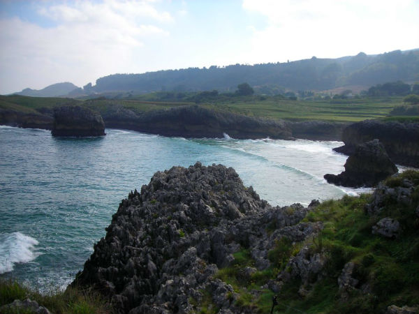 RECORRIDO: Cruzamos el pequeño y precioso núcleo de casas que rodea la iglesia de Buelna, donde dejamos el coche, buscando el mar, pasamos el puentecillo sobre la vía del tren y nos damos de frente con el acantilado. Pero, antes de continuar la senda hacia nuestra meta, al oeste, tomamos el camino a la derecha que lleva al espacio protegido de Cobijeru, visita obligada, con su original playa verde interior, sus grutas cársticas, su bufón marino, su derruido molino de mareas, su acantilado de formas caprichosas y su asombroso paisaje.