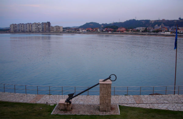 El pedrón oficial anuncia el final de la senda, que desemboca en la carretera general de salida hacia Arnao, justo frente al Balneario, con el Paseo y la Playa de Salinas detrás. Al fondo, a la izquierda, se ve La Peñona, amplio mirador rocoso sobre el mar, con su Museo de Anclas al aire libre, escoltadas de banderas y esculturas, de visita obligada, y algo más atrás el túnel que se traga el tráfico rodado. Y hacia el este, ya al final de la playa, nos acercaremos a las dunas de El Espartal, a un paso de la playa de San Juan de Nieva, ya en la Ría de Avilés.