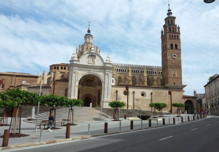 De imponentes dimensiones, el blanco brillante de su piedra contrasta con el ladrillo de su esbelta torre-campanario. Nacida sobre diseño gótico de aires franceses, se hizo luego renacentista en sus bóvedas centrales, sus vidrieras policromadas y sus frescos murales, de clasicista factura italiana, encontrados en su interior, y barroca en el pórtico principal, sin olvidar el inevitable toque islamista del mudéjar aragonés en su ornamental cerámica, su claustro de descomunales celosías y los estilizados pináculos de su cubierta.