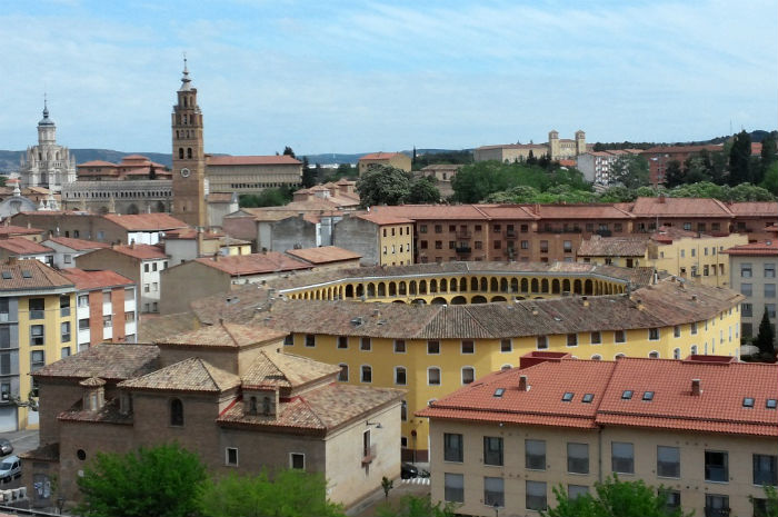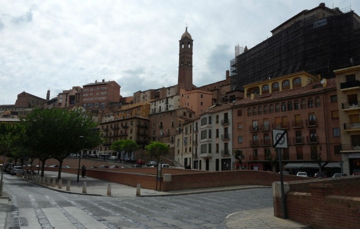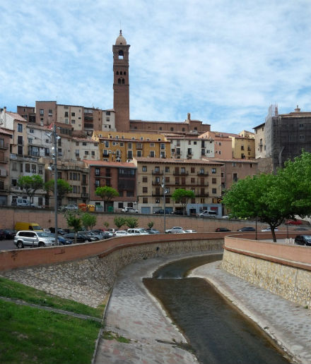 Subiendo un poco más, llegamos a la plaza Mayor, donde se celebraba el mercado. La antigua lonja, hoy Ayuntamiento, es un imponente palacio renacentista levantado sobre la muralla, cuya fachada asombra por sus dimensiones, su finísima arquería y sus ornamentales esculturas mitológicas; enfrente, la estatua del Cipotegato, que, en su tradicional fiesta de estío, espera cada año al joven homónimo vestido de colorista arlequín encapuchado que intentará zafarse de los tomatazos populares y subirse triunfante a ella. Más arriba, la iglesia de la Magdalena, románica y mudéjar, presume de tener la torre más alta del lugar, el faro local de referencia. Finalmente, en lo que fue cuartel militar del Islam y luego palacio real de Aragón, tiene ahora su residencia el obispo. El Palacio Episcopal es una construcción regia que cuelga sobre el río desde la altura rocosa y destaca por su patio y cúpula renacentistas, su galería en arcada y su singular torre.
